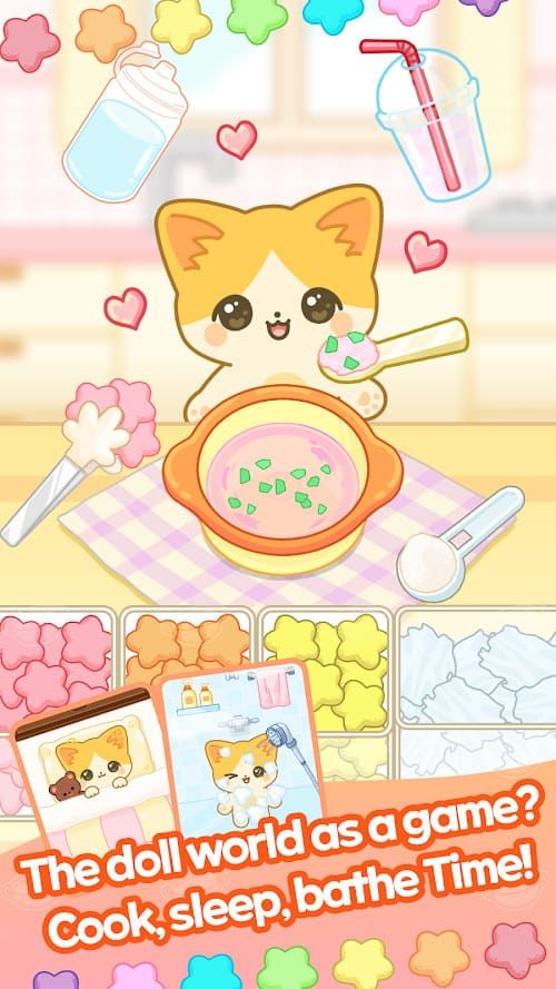 The newest addition is the doll care mode. In it, players feed a virtual doll, bathe her with bubble and water sounds, then brush her hair and put her to bed. Similar to photocard mode, it's entirely separate from the malatang shop: there's no currency, progression, or narrative crossover. Its charm comes in the cozy, low-stakes ritual of caring for something small and cute, reinforced by gentle ASMR audio cues throughout.