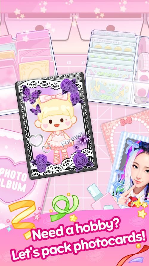 The photocard packing mode completely flips that on its head. You select a photocard, put it into a protective sleeve, and then sticker it up to look pretty-a simulation of the real-world personalization of collectible cards shared on social media by fans. It is tactile, soothing: plastic sleeves rustle, the peeling of stickers, the soft tapping as you push them all into place. It's purely cosmetic; there is no competitive or strategic aspect to it, and the players can share their creations with friends in-game.
